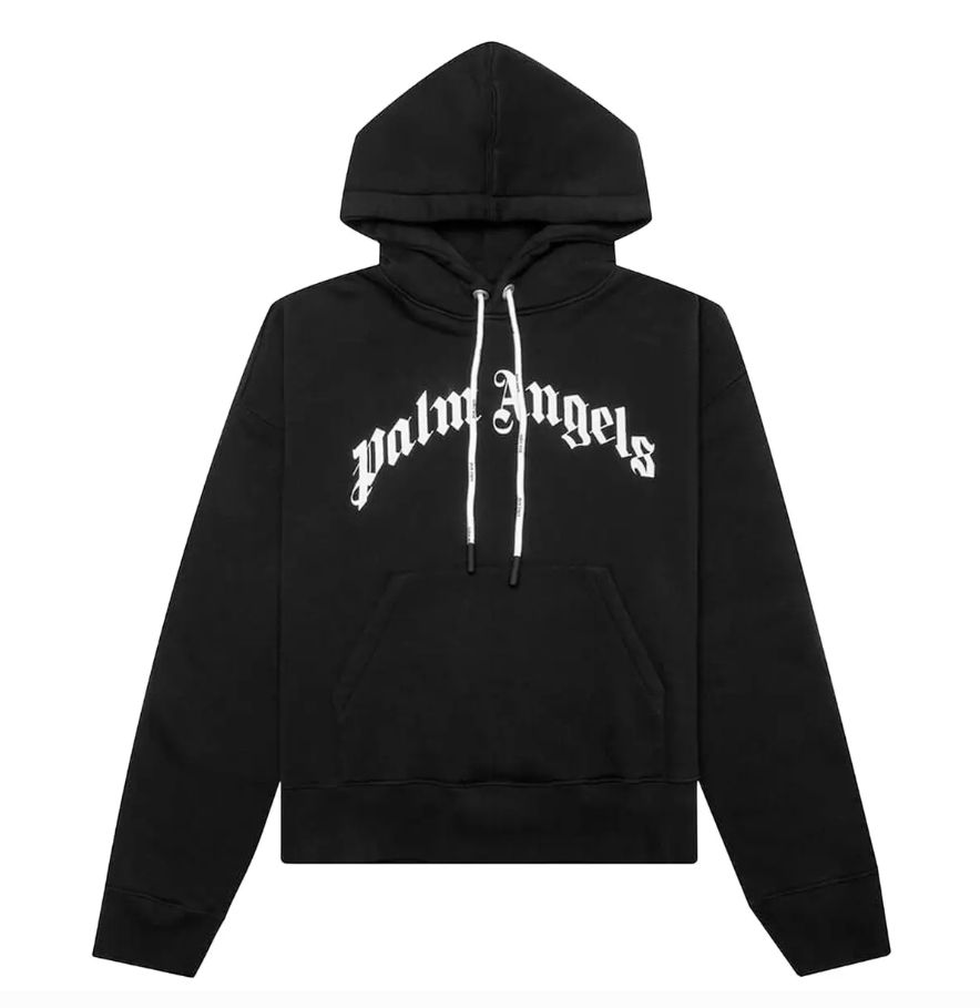 The defining feature is the curved Palm Angels logo emblazoned across the chest in contrasting white, creating a striking visual against the black base. A spacious hood, ribbed cuffs, and hem ensure comfort and structure, while the monochrome colorway keeps the design versatile and effortlessly stylish.