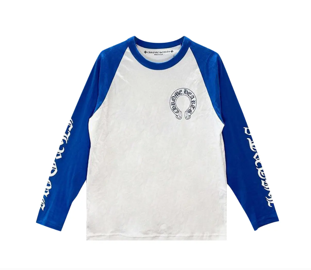The Chrome Hearts Long-Sleeve Horseshoe Baseball Tee in White/Blue blends classic baseball styling with the premium quality Chrome Hearts is known for. Made from soft, high-quality cotton, this tee features a crisp white body paired with bold blue sleeves for a clean, athletic look.